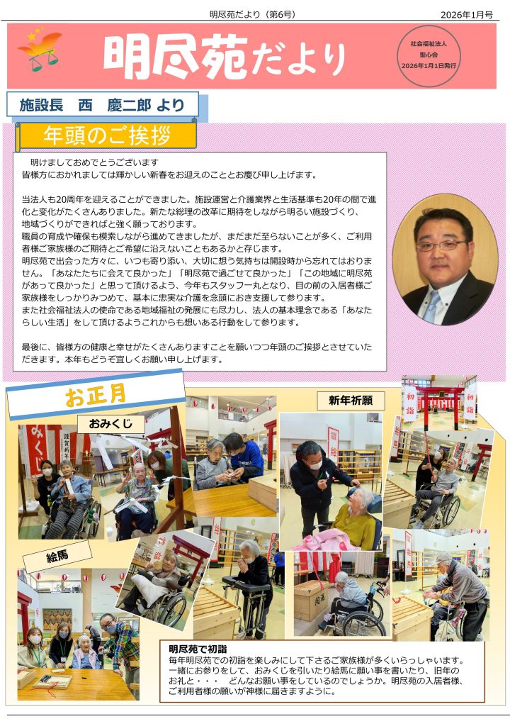「明尽苑だより 2026年1月号」を掲載しました 2026年1月16日 最終更新日時 : 2026年1月16日 hp_admin 明尽苑では、特養・ショートステイ・デイサービスの各広報紙を統合し「明尽苑だより」として発行しております。「明尽苑だより」のページに「2026年1月号」を掲載いたしましたので、お時間のある時にご確認ください Follow me! @myoujinen FacebookXCopy